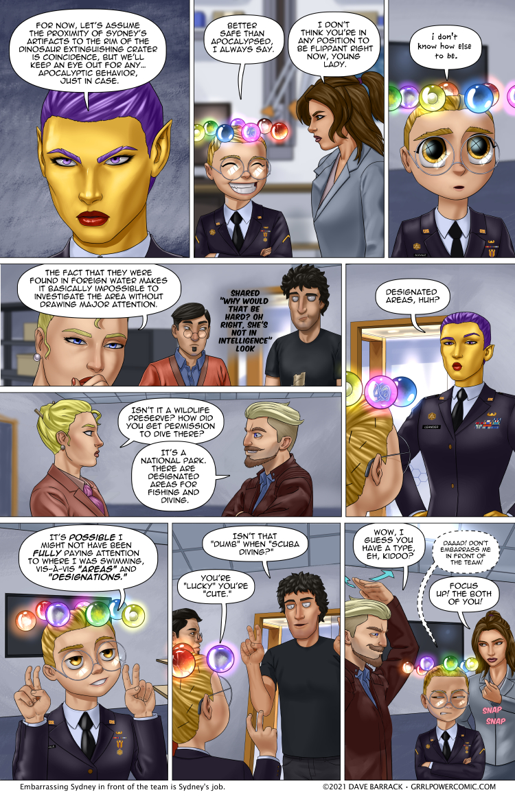 Anyway, what going on in this page? Oh, right, well, it’s possible Sydney went swimming where few other people did, but even if she drifted out of bounds a bit, it’s not like she would have been the first person ever to be near the area the orbs were found in. It’s safer to assume either they were recently uncovered by some event, or there’s just something about Sydney that attracted them.
