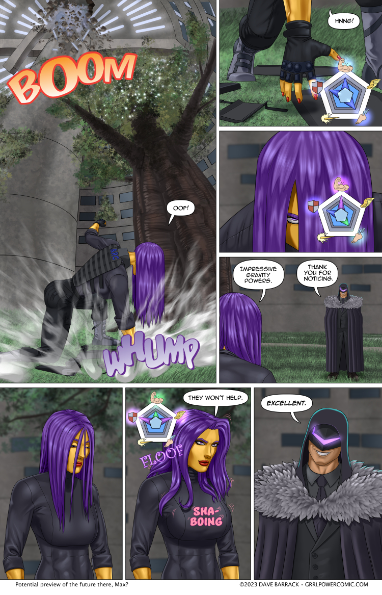 And then he drops his gravity well projects, and she goes smashing through the ceiling before she can adjust. Nyuk nyuk nyuk. Although it depends on whether the shield or the flight is doing most of the work here, but either way it’s pretty impressive to force her into allocating so much of her power pool to defense. Remains to be seen how much mobility and offensive power she has left, I’m betting well above a baseline human still.