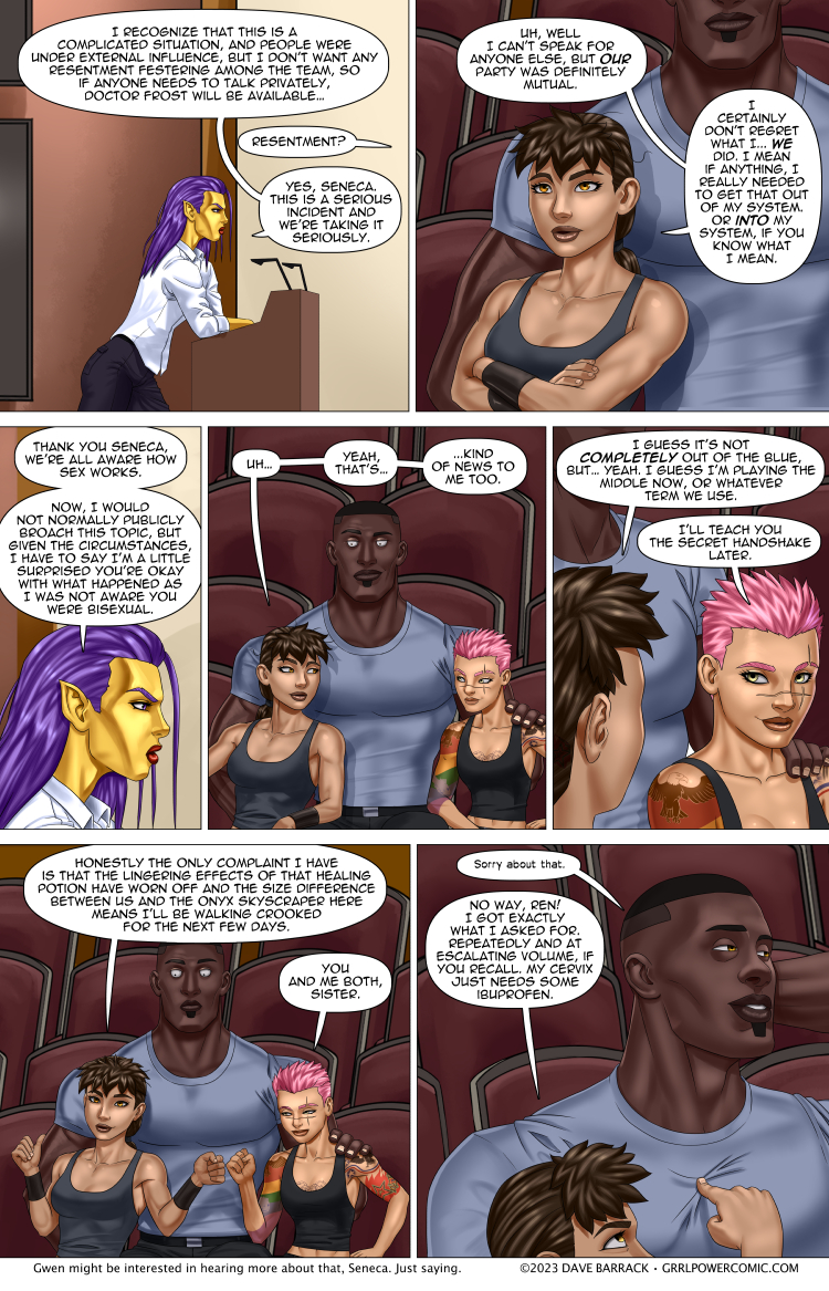 Maxima seems surprised here that so far no one is freaking out about what’s happened (and if that bugs you, give it a few pages, I can only fit so much in each strip) but keep in mind, she didn’t exactly order people to sit with their lust buddies, but that’s exactly what’s happened. There isn’t anyone sitting on opposite sides of the auditorium glaring at anyone else. Actually, everyone seems to have a lingering case of the handsies. If she hadn’t called the base to this meeting, there would probably be a lot of cuddling going on right now – cuddling with a lot of post-coital “Wow I can’t believe we just did that.” and “What got into us?” and “Is this going to be awkward now?”