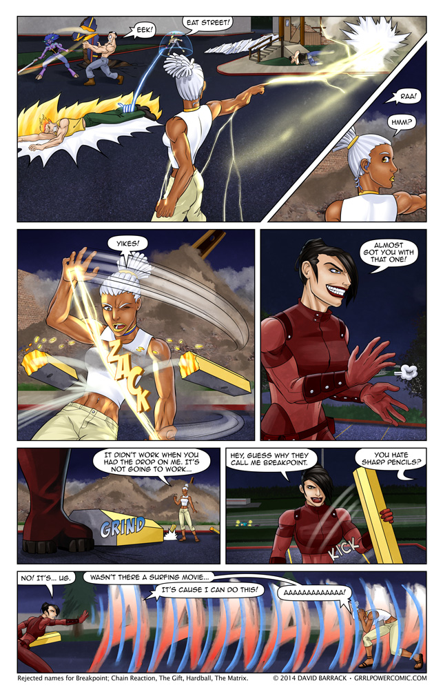 Breakpoint appears courtesy of Avery Leckrone, one of the high roller Patreon supporters. When I asked for some cameo ideas, he handed me a slew of links to his characters. I chose Breakpoint because the team is poorly equipped to handle sonic attacks like this at the moment. As with most of Avery’s characters, she’s normally a hero, so we can assume extenuating circumstances, like this being her mirror universe twin. Also I’m sure her name has nothing to do with Keanu Reeves movies, but seriously sometimes the most difficult part of each page is the title and the little quip at the bottom. But who knows, maybe she’s a fan. Also, I’m not sure her name specifically has anything to do with the fact that she can do sonic blasts, she actually has an interesting mix of powers, but I wanted to get her name on the same page she debuted on.