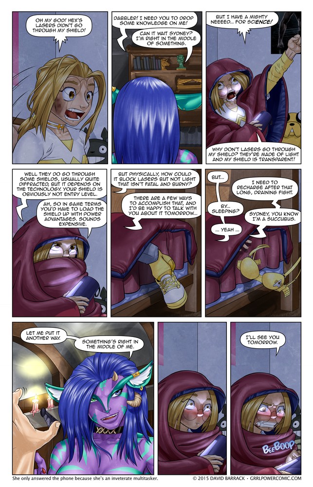 This is actually the last page of book 1. It’s kind of a weird tone with the succubus recharging bit, but really the point of the page was trying to tie back into the flash forward from the first few pages. I will level with you guys, when I started doing the comic five years ago, I really hadn’t thought all the way through to the end of the book. I thought the only good way to do it was to at least partially address the point of contention from the role playing game, namely lasers vs. transparent things. Obviously if Sydney was trying to claim that lasers should go through transparent shields and everyone at the game knew Sydney was a superhero with a shield that blocked lasers (which they did) someone would have pointed that out to her. I maaaaay go back and edit a line in those first few pages to read something like “I didn’t buy that advantage for OmniGal, so KopyKraut* can’t have it either.” so it all ties in better. I don’t think that would change the feel of those early pages.