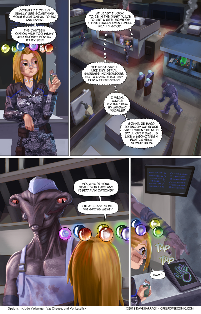 and yet public urination doesn’t seem to be an issue, that alien in the bottom left of panel two isn’t even trying to hide off the main walkway.