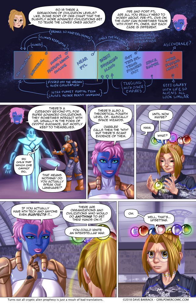 I get the impression from the chart that the Alari were actually just in the “barely squeaking along” group. After all Dabbler’s first impression was that the local version of the Galaxy Police Federation Alliance or whatever Xevoarchy’s equivalent of military aligned worlds is, had taken them out for being to much of a jerk ass civilization to other developing worlds. We know something else got to them first, and that line “pissed off the wrong alien civilization” could be foreshadowing or a subtle hint to that’s what happened here.