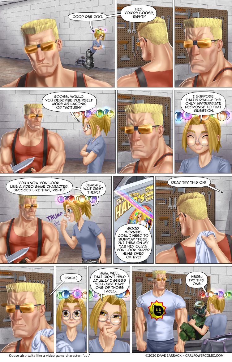 This is a weird page, admittedly, but I’ve been planning it since the first page Goose appeared on… Holy shit, I forgot about those armored suits. Hah hah, those should probably show up again sometime. Anyway, Goose admittedly looks a bit… Nukem-esque, and people commented on it. So of course, I decided to do a page about it 8 years later. That’s how I roll.