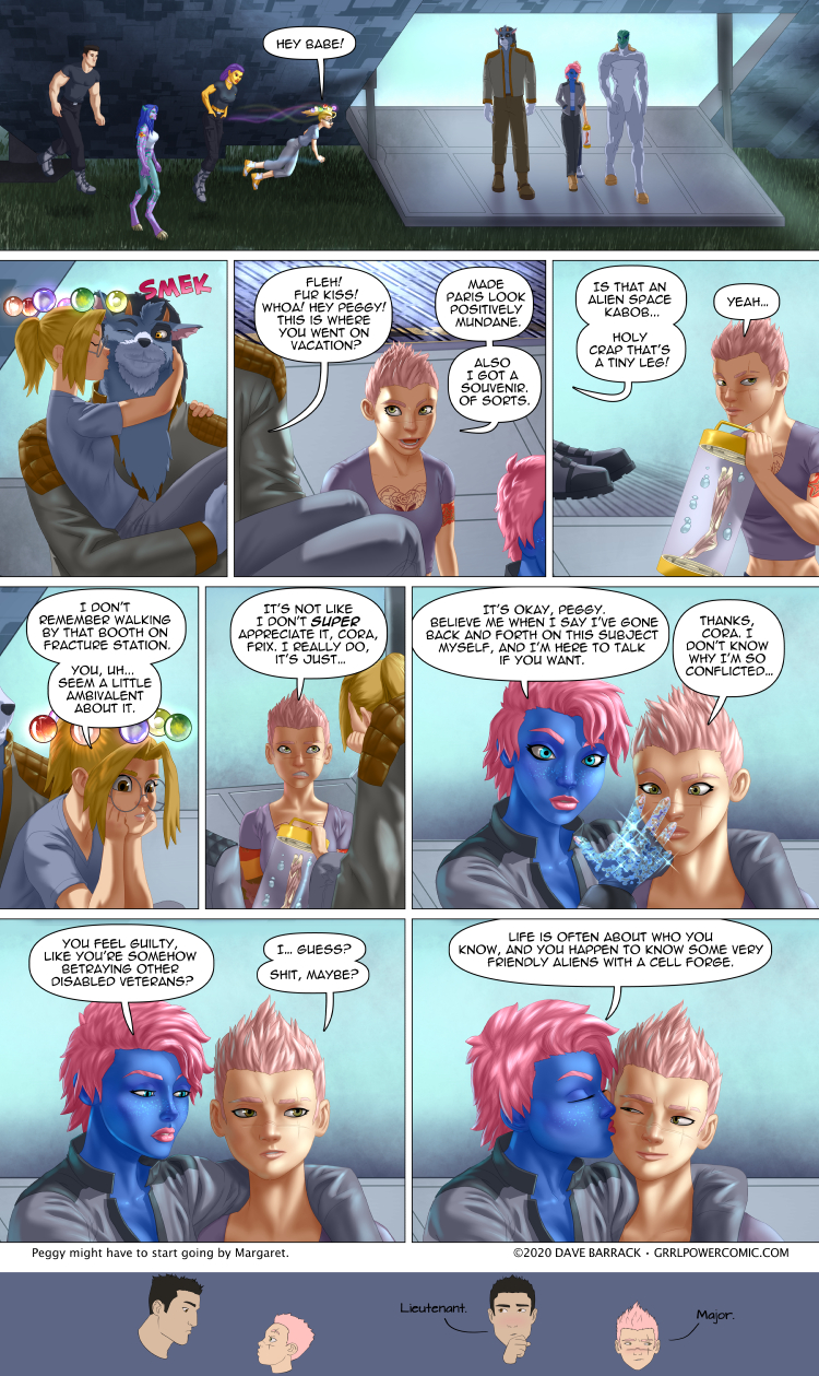 This is one of those pages where the Grrl-verse kind of got away from me. I hadn’t ever intended to grant Peggy a new leg, but… for Cora and her level of technology, it’s a trivial fix. They don’t want to give her a cybernetic leg, or a hard light one like what Cora has, because that would be handing Earth tech they haven’t earned yet, but growing a new leg from her DNA and attaching it with the stuff in their med bay wouldn’t pollute Earth’s tech tree in any way.